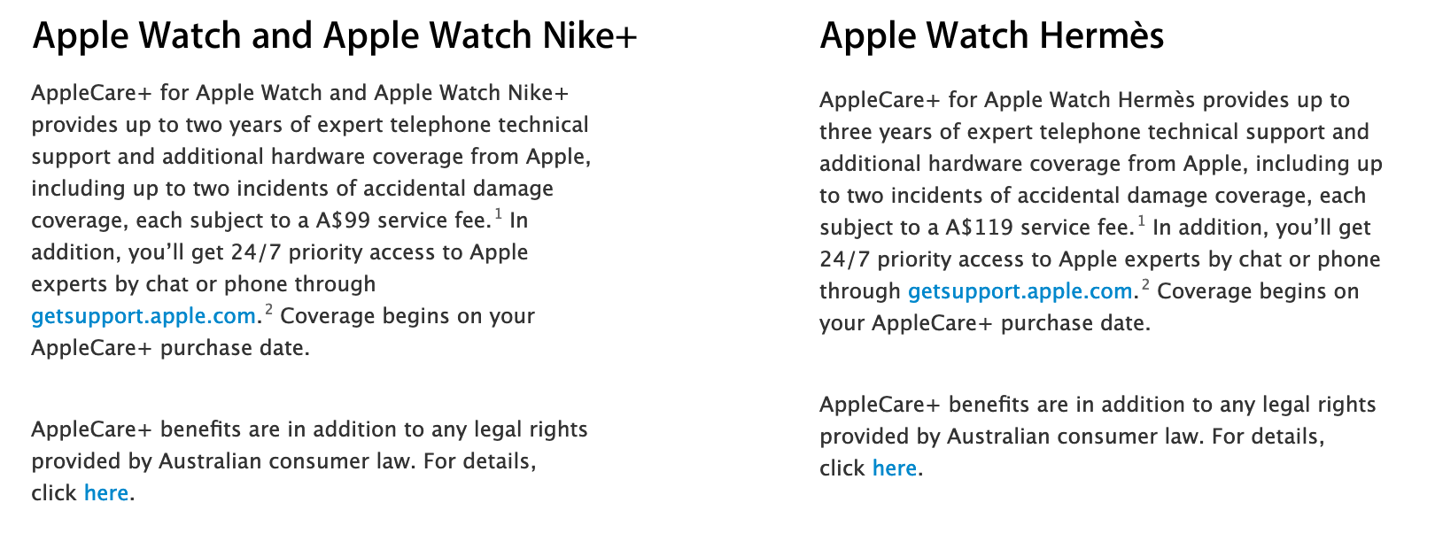 애플케어 가격을 확인하기 위해 관련 페이지로 가니 79 호주달러 부터 시작 된다고 나옵니다. 확인해 보니 버전별로 아래와