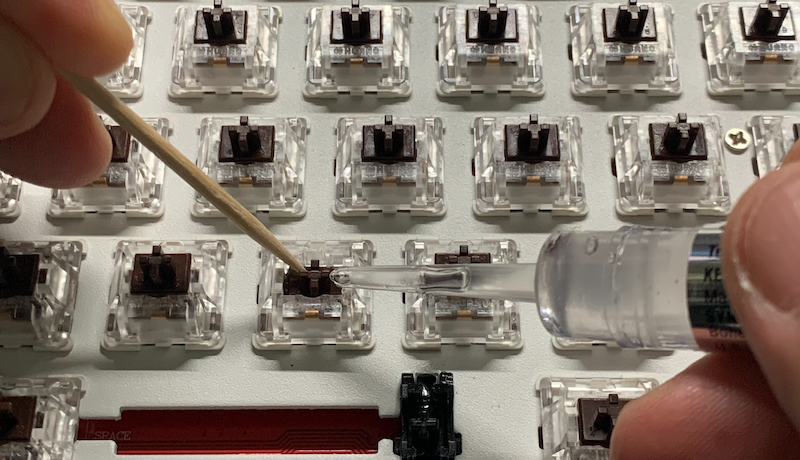 보드를 다시 조립 후 스위치부터 오일을 주입 합니다. 이쑤시개로 누른 다음 틈사이로 한방울 씩 넣었습니다.