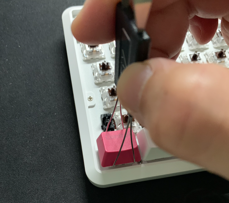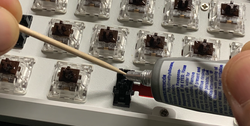 스위치가 핫스왑이 아니라 스테빌라이저는 분해할 수가 없어 플라스틱 지지대 부분에 이쑤시개로 찍어 묻혀 주었습니다.